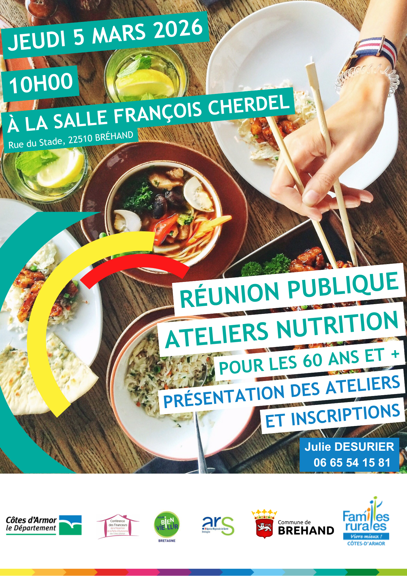 À la découverte d'une suite de 6 ateliers pour s'informer, pratiquer et échanger sur les besoins nutritionnels et la prévention des pathologies associées aux carences et à la sédentarité. Au programme notamment; la découverte sur site d'un producteur local, de la cuisine, du sport adapté et surtout de la bonne humeur ! Au plaisir de vous rencontrer autour d'un café le jeudi 5 mars prochain. Julie Désurier - Familles Rurales fédération des côtes d'Armor avec l'association locale de Rostrenen.