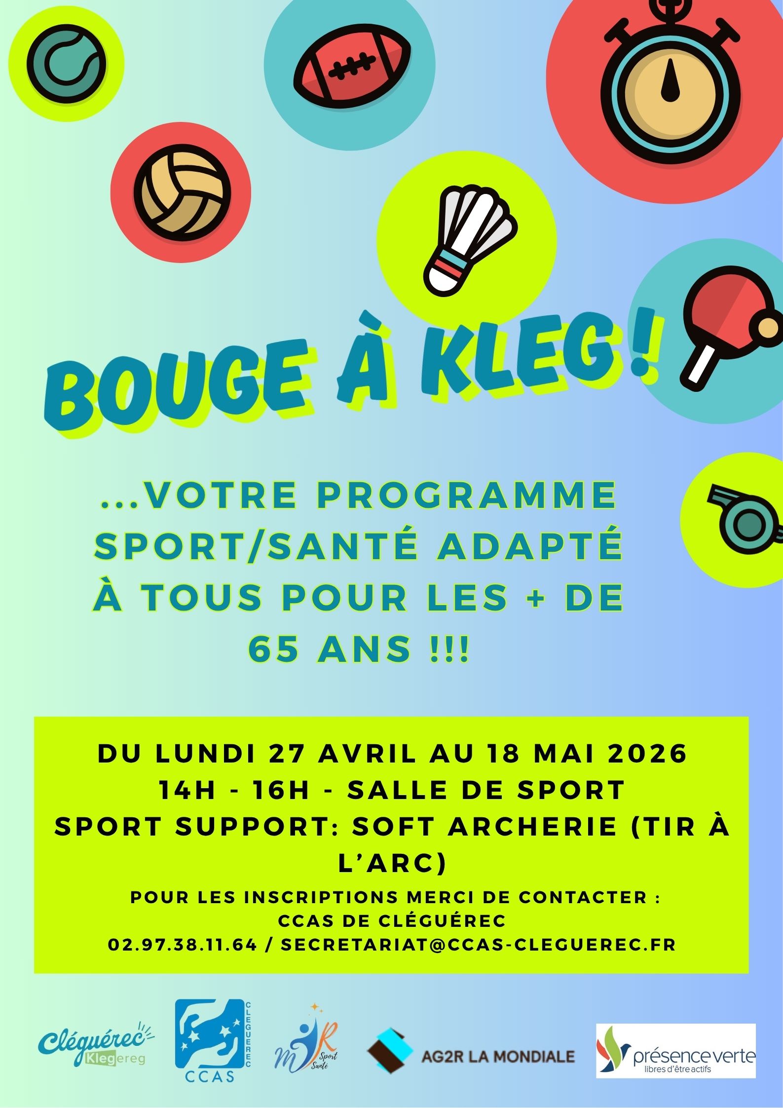 Bouge à Kleg !, une activité de sport adapté destinée aux seniors de plus de 65 ans résidant sur la commune.Les séances se dérouleront chaque lundi de 14h à 16h à la salle de sport de Cléguérec. Elles seront encadrées par un éducateur en activité physique adaptée, garantissant un accompagnement sécurisé et personnalisé. L’objectif est de favoriser le bien-être, la mobilité et l’autonomie des participants dans un cadre chaleureux et bienveillant.Des objectifs variés et essentielsL’activité Bouge à Kleg ! a été pensée pour répondre aux besoins spécifiques des seniors :· Réduire le risque de chute chez les plus de 65 ans· Stimuler et maintenir les capacités cognitives et fonctionnelles· Lutter contre l’isolement des personnes vivant à domicile· Encourager une pratique sportive régulière, ludique et adaptéeDes cycles évolutifs au fil de l’annéeLes cycles d’activité seront organisés en fonction du calendrier scolaire. Pour chaque cycle, une discipline sportive différente sera utilisée comme support pédagogique : badminton, handball, basketball, tir à l’arc, et bien d’autres encore.Un engagement soutenu par AG2R La MondialeCette action est rendue possible grâce au soutien financier d’AG2R La Mondiale, qui accompagne la commune dans son engagement en faveur du bien-vieillir, de la prévention de la perte d’autonomie et de l’accès à l’activité physique pour tous.Formalités d’inscriptionLa participation à l’activité nécessite la fourniture d’un certificat médical de non contre-indication à la pratique sportive.Gratuit – Destiné aux habitants de Cléguérec de plus de 65 ansContact / Informations :