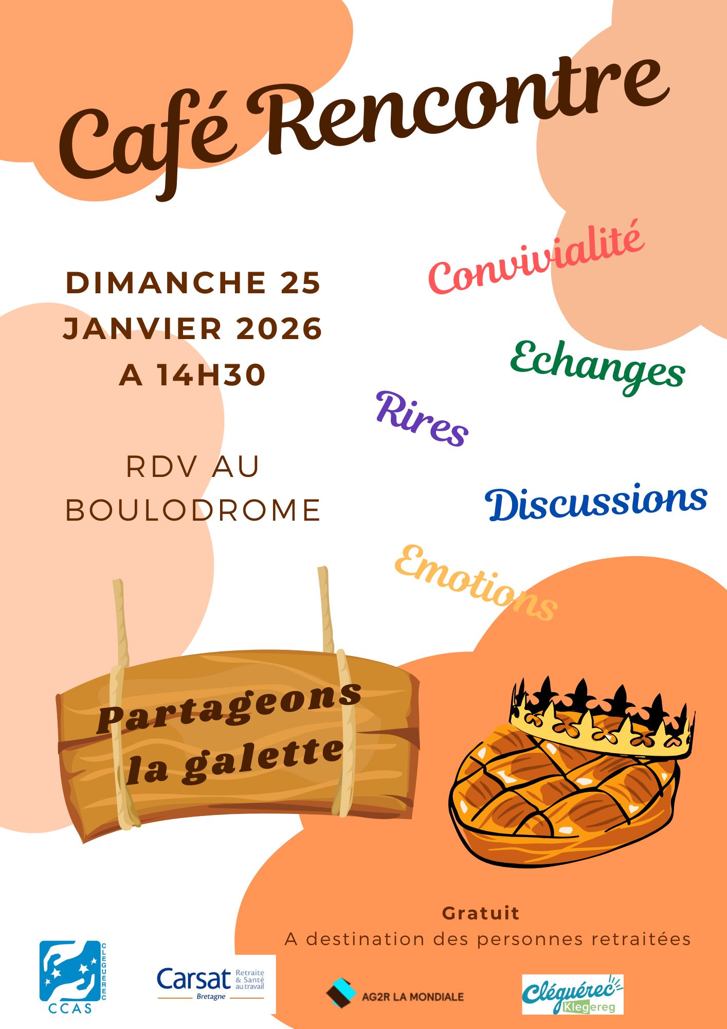 Le succès rencontré par les cafés-rencontre renforce notre souhait de poursuivre cette action sur la commune. Nous débuterons donc l’année par un moment convivial autour de la galette des rois, qui se tiendra au boulodrome de Cléguérec le dimanche 25 janvier 2026 de 14h30 à 16h30.
