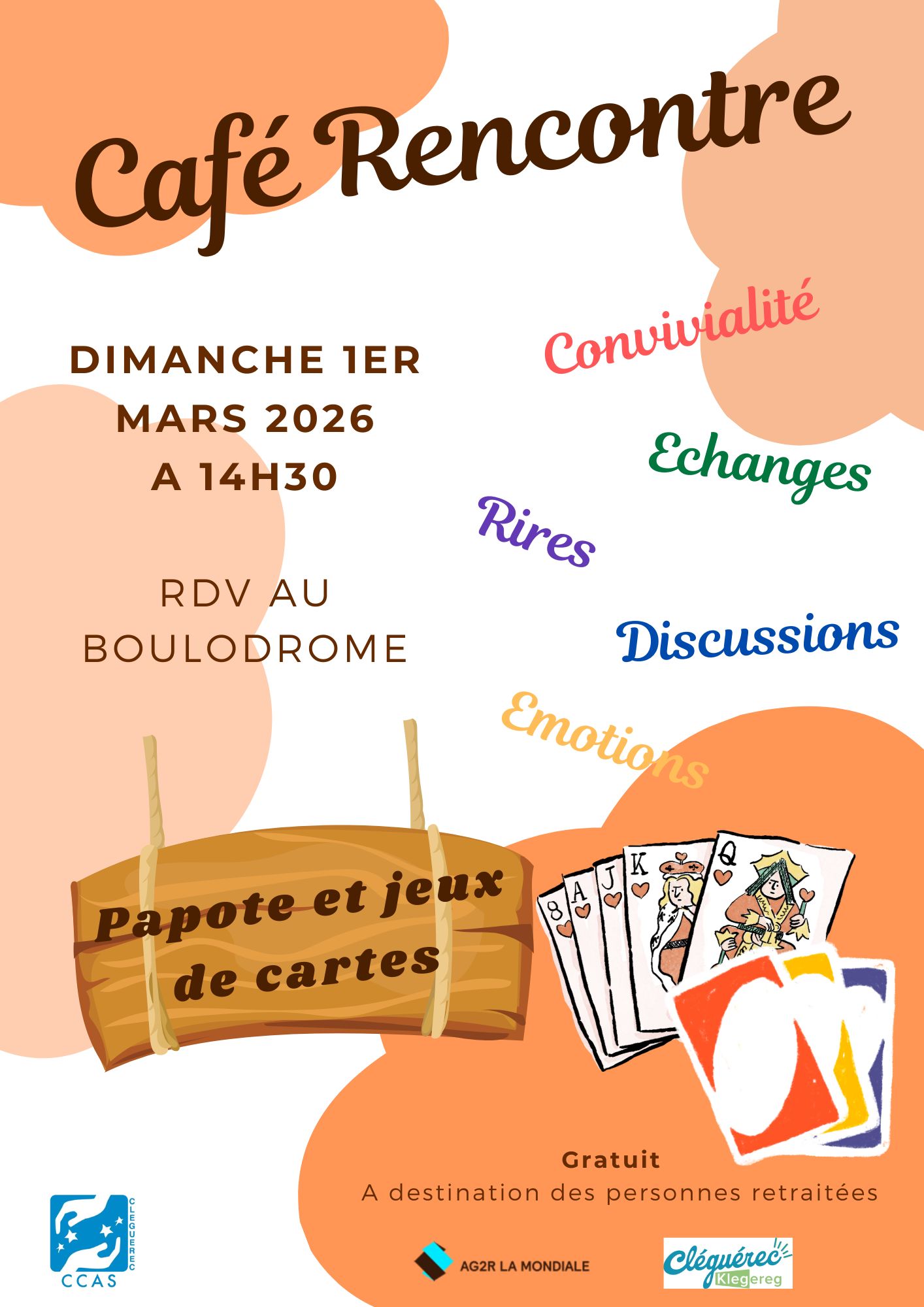 La prochaine rencontre aura lieu le Dimanche 1er mars 2026 à 14h30 au boulodrome.Au programme : - Jeux de carte - Jeu de boules (pensez à apporter vos boules) - Créations en fleurs séchées (à confirmer)