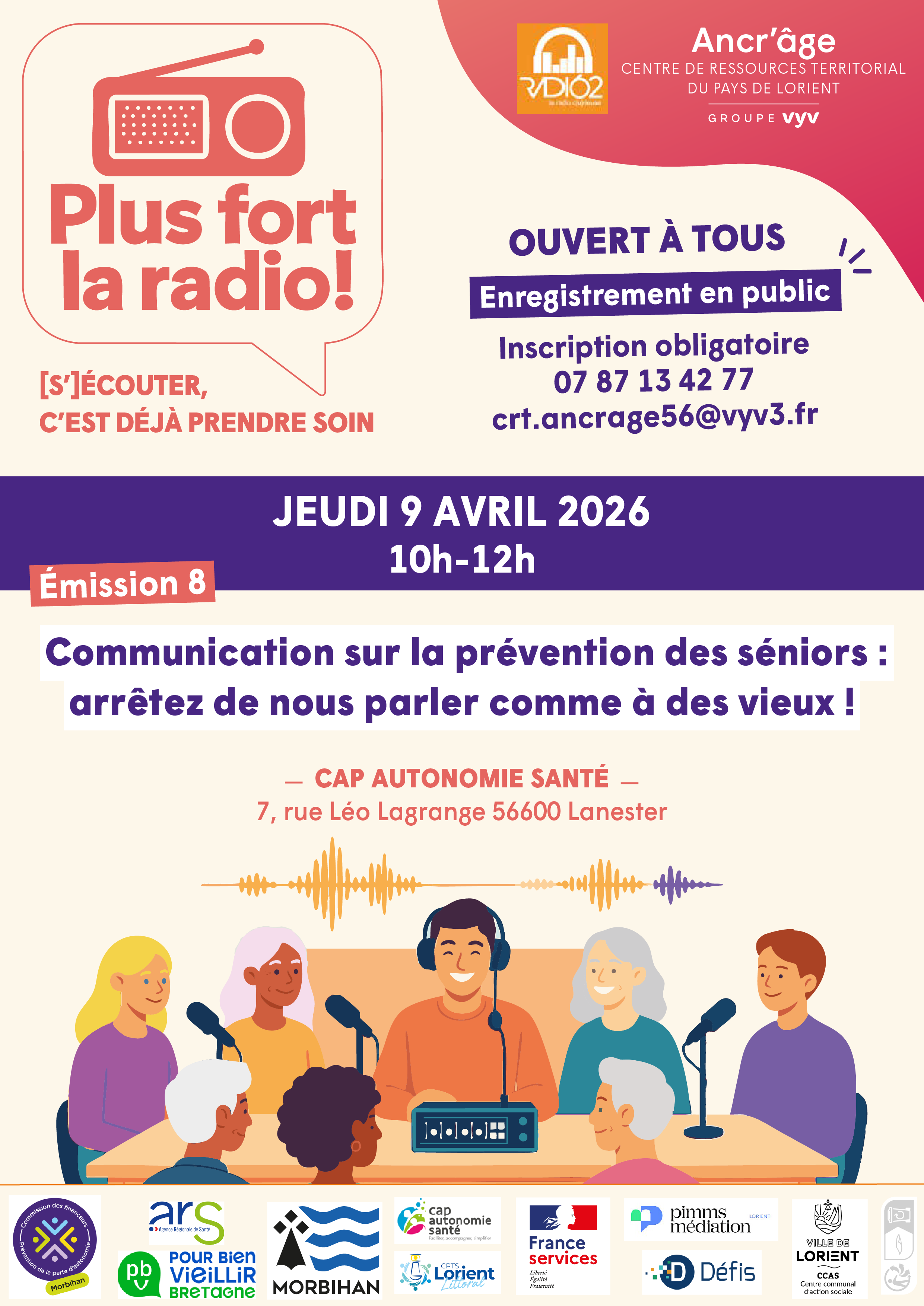 Plus fort la radio ! est une émission co-portée par le Centre de ressources territorial du pays de Lorient de VYV3 Bretagne et Radio 162. Financée par la conférence des financeurs et soutenue par l’ARS et le conseil départemental, cette initiative vise à diffuser de l’information autour de la prévention des séniors.