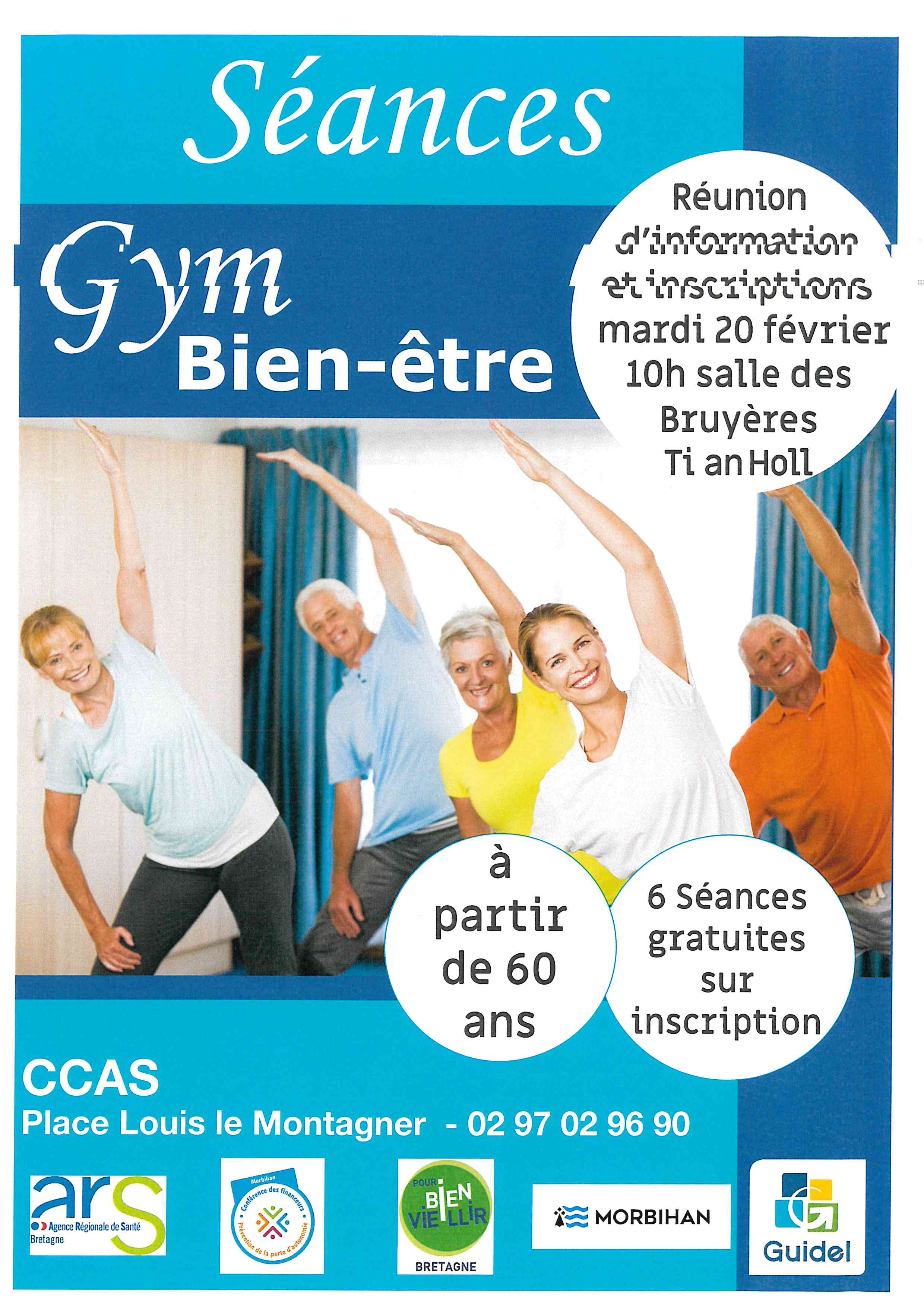 Le CCAS de GUIDEL organise un atelier gym bien-être pour les séniors. Les séances se dérouleront tous les mardis, du 12 Mars au 16 Avril 2024. Inscriptions à l'issue de la réunion d'information qui aura lieu le 20 Février à 10h à la salle des Bruyères (Ti an holl). Gratuit - Places limitées. Contact : 02.97.02.96.90