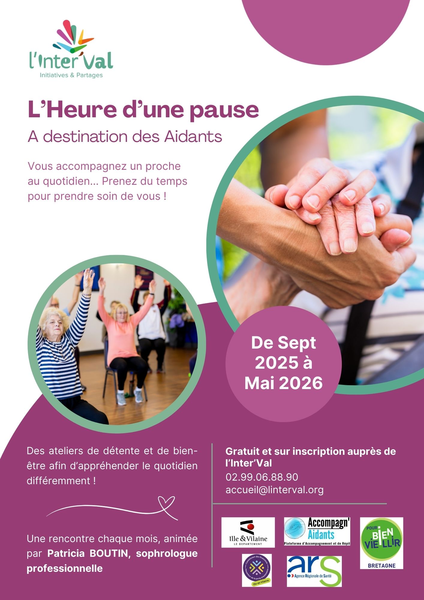 L'heure d'une pauseVous accompagnez l’un de vos proches au quotidien ? Prenez du temps pour prendre soin de vous !Si vous connaissez une personne dans cette situation, n'hésitez pas à lui transmettre ces informations.Chaque mois, de septembre 2025 à mai 2026, nous vous proposons des actions ressourçantes pour faire une pause avec le quotidien. Ces rencontres sont animées par Patricia Boutin, sophrologue professionnelle.La mobilité et la présence auprès de votre proche ne doivent pas être des freins, n’hésitez pas à nous contacter.Des solutions sont envisageables !