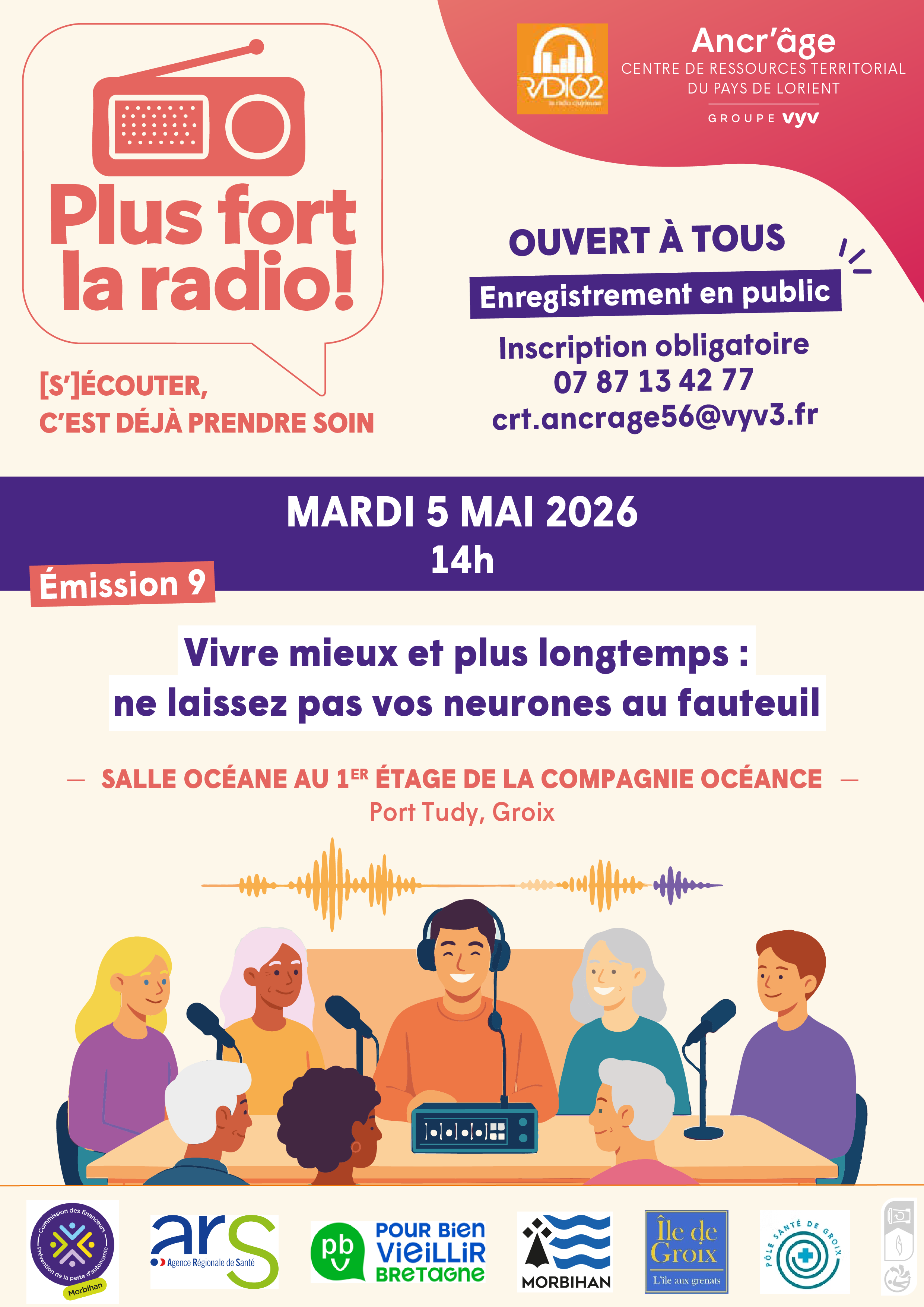 Conférence santé. Le CRT ancr'âge invite à assister à l'enregistrement radio sur le thème « Mieux vivre et plus longtemps : ne laissez pas vos neurones au fauteuil ». Le journaliste de radio 162 sera entouré d'experts pour échanger sur cette thématique. Mardi 5 mai de 14 h à 16 h, Compagnie Océane, Gratuit - sur inscription.