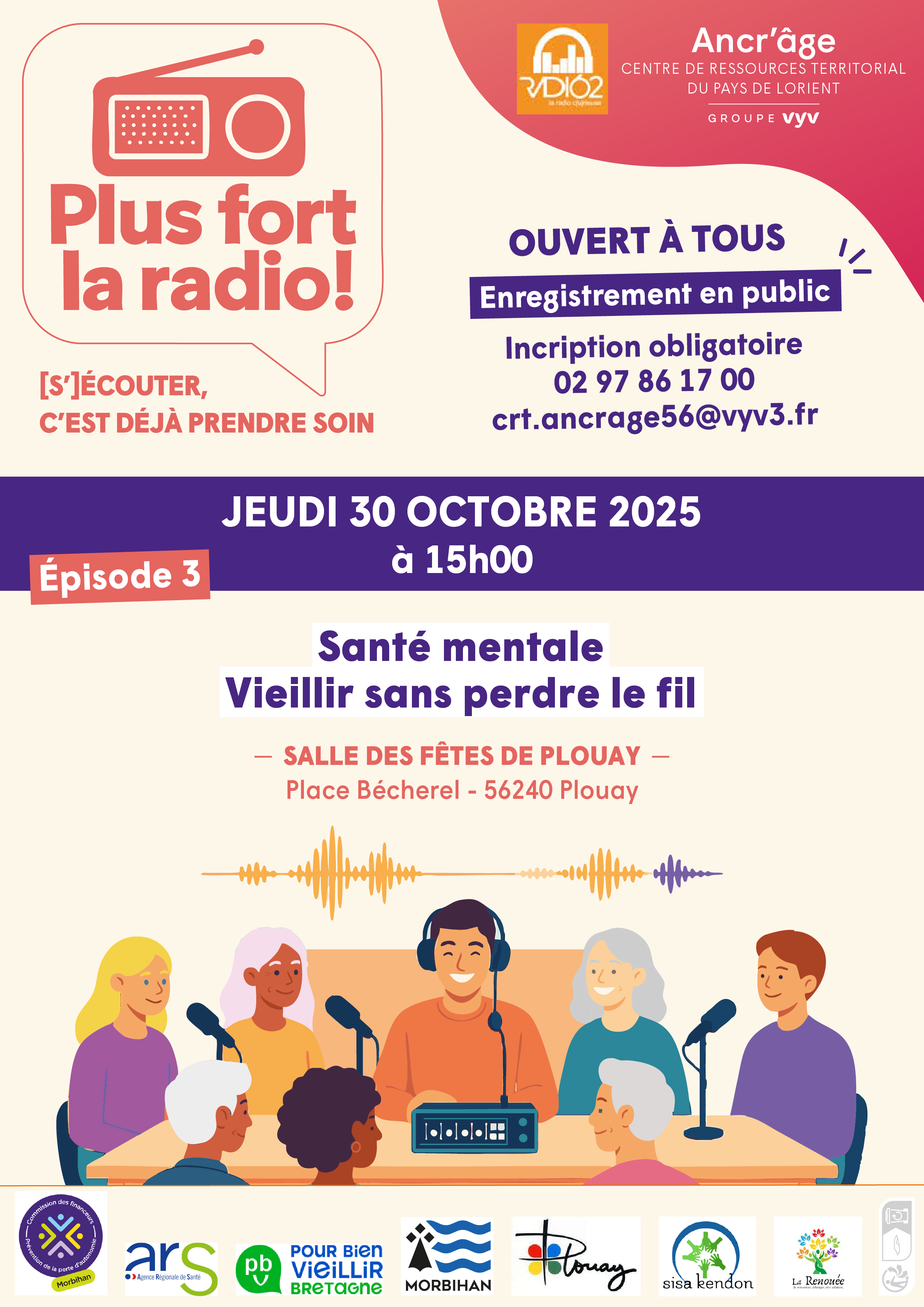 Le Centre Ressources Territorial Ancr'âge propose de participer à l'enregistrement d'une émission de radio "Plus fort la radio!" animé par Radio 162 sur le thème : "Santé mentale : vieillir sans perdre le fil" avec la présence d'experts, professionnels et témoins. Financé par la conférence des financeurs, il s'agit de l'épisode 1 sur 10. L'évènement se déroule à la salle des fêtes de Plouay le 30/10 de 15h00 à 16h00. Venez assister à une expérience innovante et enrichissante.