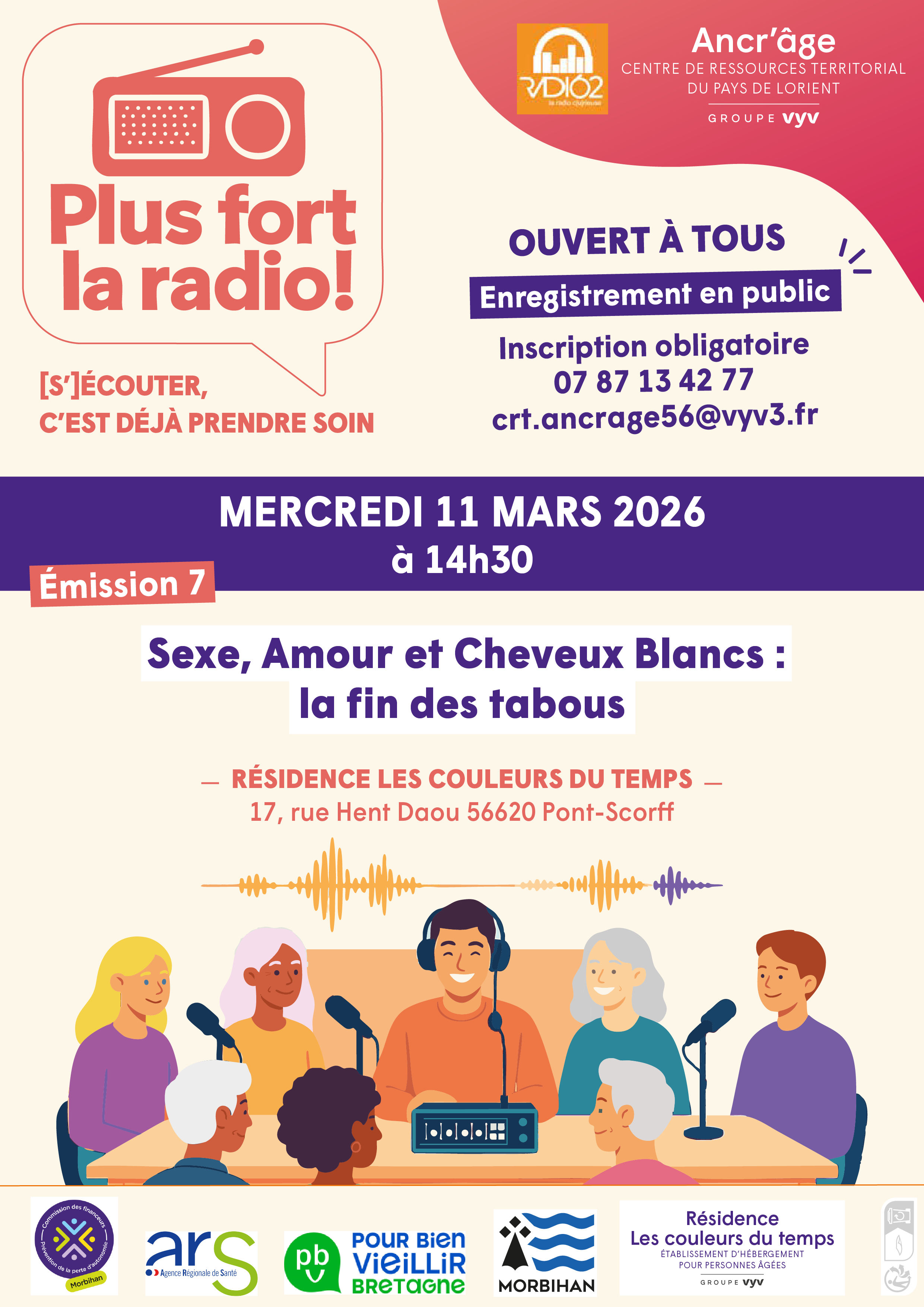 Plus fort la radio! est une émission co-portée par le Centre de ressources territorial du pays de Lorient de VYV3 Bretagne et Radio 162. Financée par la conférence des financeurs et soutenue par l'ARS et le conseil départemental, cette initiative a pour objectif de diffuser de l'information autour de la prévention des séniors. Pierrick MULLER journaliste réunira plusieurs expertes pour échanger autour de la prévention de sexualité et la vie affective chez les séniors : Audrey MASSEFERI, sexothérapeute, Audrey VOUE, infirmière en formation de sexologie, Séverine LEROUX, infirmière en pratique avancée. Venez assister à l'enregistrement de cette émission le mercredi 11 Mars à 14h30 à la résidence des Couleurs du temps à Pont Scorff. Gratuit sur inscription. Places limitées. A l'issu de l'enregistrement, vous pourrez poser toutes vos questions à nos invités.