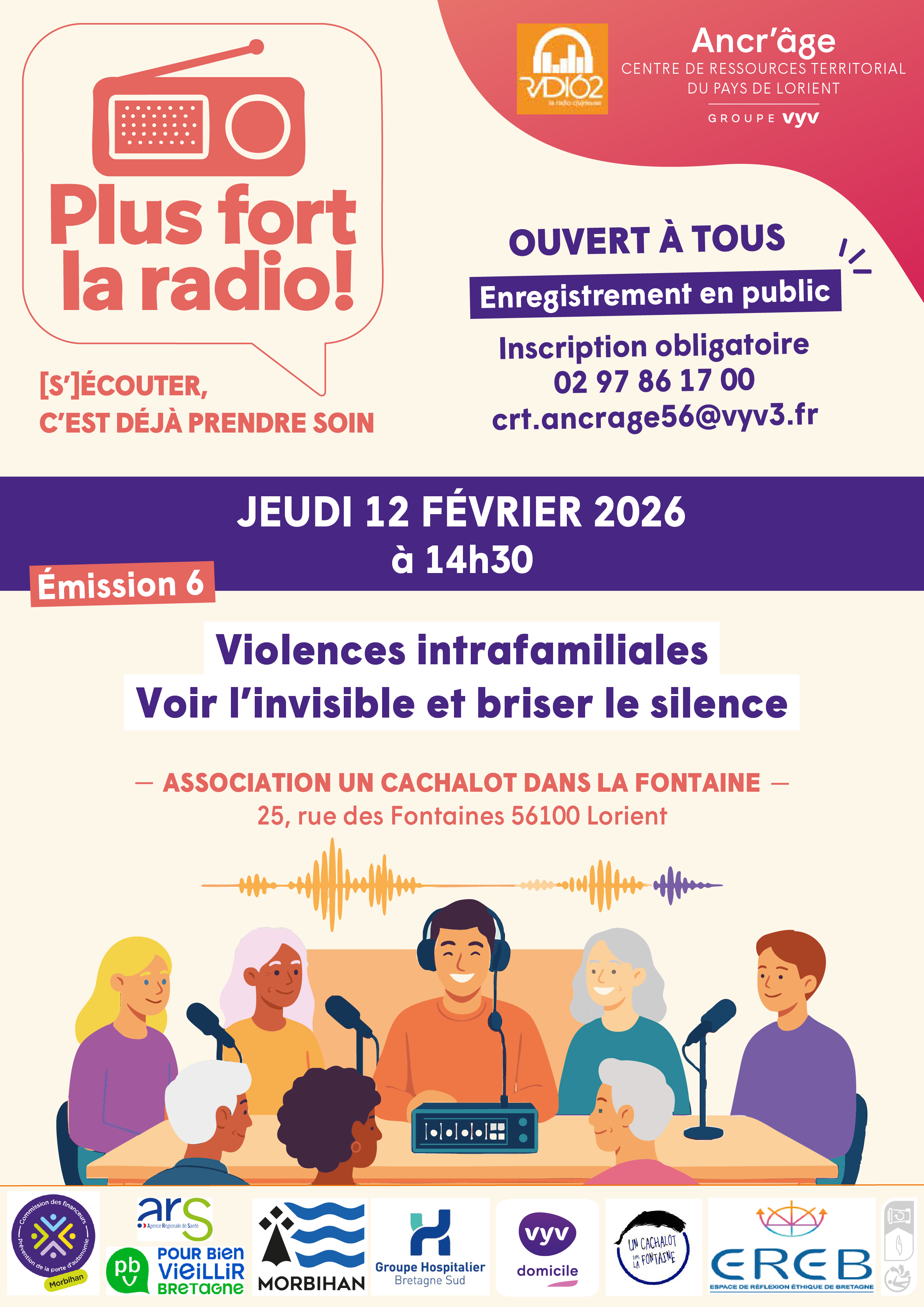 Le centre ressources territorial Ancr'âge de VYV3 Bretagne et Radio 162 organisent des émissions de radio appelée Plus fort la radio! pour diffuser des informations de prévention. L'émission 6 aborde le thème des violences intrafamiliales en présence de plusieurs experts. Nous invitons les citoyens à venir participer à l'enregistrement le jeudi 12 Février à 14h30 au sein du lieu "un cachalot dans la fontaine" à Lorient.